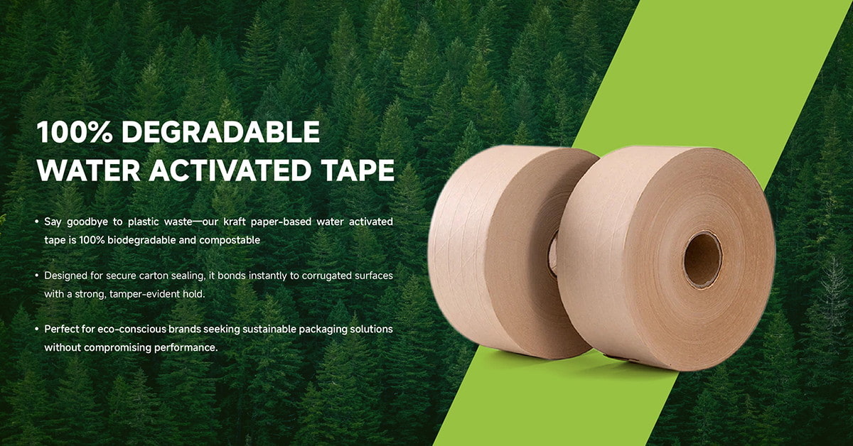شريط JL3 المنشَّط بالماء مصنوع من ورق كرافت طبيعي وصمغ نشا نباتي. وهو ليس قابلًا للتحلل البيولوجي بنسبة 100% فحسب، بل قابل للتحلل أيضًا بالكامل، مما يجعله الخيار الأمثل للعلامات التجارية المهتمة بالبيئة.
